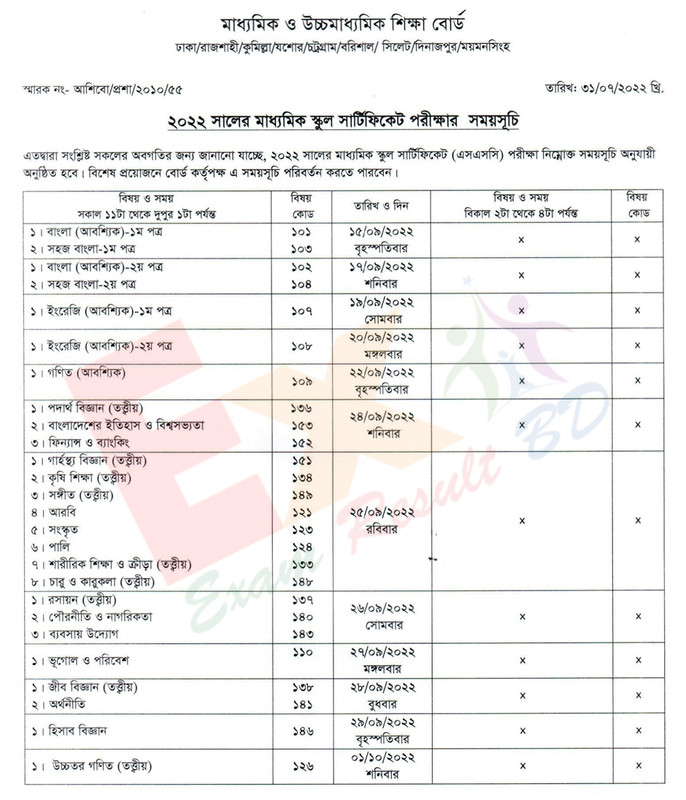 বাংলাদেশি মোট ৯টি সাধারণ শিক্ষা বোর্ড এবং ২টি বিশেষ শিক্ষা বোড রয়েছে। এসএসসি পরীক্ষার রুটিন মার্চ এবং এপ্রিলের মধ্যে প্রকাশিত হবে এবং পরীক্ষা শুরু হবে মে থেকে এবং পরীক্ষা শেষ হবে জুন ২০২৩।